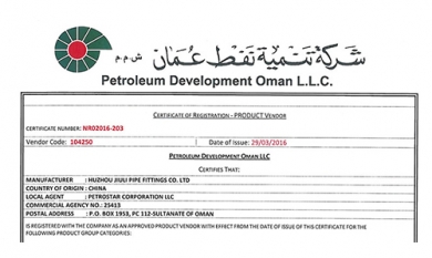 近日,久立管件被正式授予“阿曼石油开发公司(以下简称PDO)批准供应商证书”,批准包括了奥氏体不锈钢、双相钢,超级双相钢和镍基合金等材质无缝和焊接管件,
